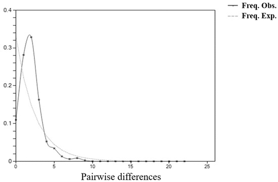 Additionally, the haplotype network structure (Figure 1) revealed recent expansion events, which have been confirmed by the negative results of the demographic population parameters, test Fu’s Fs and Tajima’s D (Table 1). Data on genetic diversity, quantified by haplotype diversity (Hd) and nucleotide diversity (Pi), is summarized in Table 2. The overall values demonstrated high haplotype diversity 0.878 (Hd) and low nucleotide diversity 0.0043 (Pi). To test the hypothesis of population expansion in M. apiaster, the distribution of pairwise differences was calculated using the DnaSP version 5.0. Unimodal mismatch distribution and the goodness-of-fit of the observed data (Raggedness statistic r) revealed a model of sudden population expansion, subsequently to the last glacial bottleneck event (Figure 2). This finding was also supported by the Raggedness statistic with r = 0.0722 between observed and simulated data.