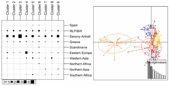 The direction of the population movements based on the gene flow among the populations and estimated throughout the software GeneClass version 2.0 [38], detected the following routes: RLP/BW (western Germany) to Northern Asia, Saxony-Anhalt (eastern Germany) to West Asia and to RLP/BW, Northern Africa to East Europe, Southern Africa to Greece, Western Asia to East Europe and Greece to Western Asia.