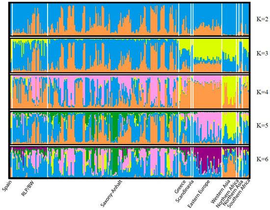Graphic representation of Bayesian cluster analysis conducted in a structure based on six microsatellite loci performed with a K from 2 to 6. Population names are provided under the graphics. Each individual is represented by one vertical line and the colors point toward the probability of belonging to each of the genetic clusters.