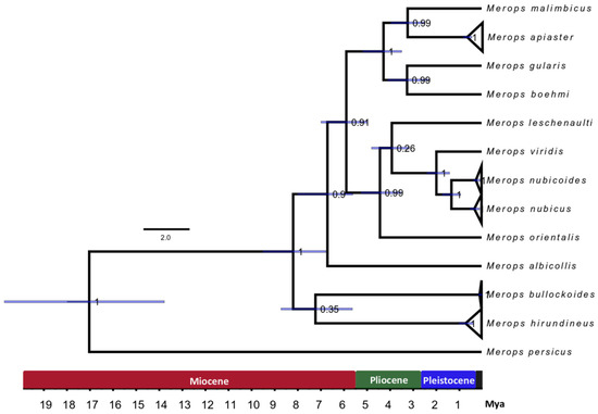 The Neoaves appeared in the Cretaceous but rapidly radiated in the early Tertiary, with intensive speciation processes during the Eocene. The origin of the Coraciiformes, to which the Meropidae belong, is dated to the Late Eocene circa 55 Mya [43]. Contributions of Woodruff 2010 [44] on the biogeography of Southeast Asia highlighted that landscape modifications of this region have resulted in multiple sea-level oscillations, successive biotic compressions, and expansions. Intensive diversification of taxa in the genus Merops was dated to the Pliocene and Pleistocene periods. Many bird species of the rainforests have also differentiated since the late Miocene and mid-Pliocene [45].