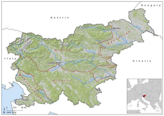 Owing to the mountainous character of the Alpine and Dinaric regions, Slovenia’s average elevation is slightly above 556 m [46]. The Alpine region in the northern and western parts of the country (42.1% of its total area) includes the highest mountains and the highest-lying valleys of the major rivers, while high plateaus, deep and narrow valleys and flat karst poljes (karst plains) characterize the physical relief of the Dinaric region (28.1%) in the south [47]. With their intermittent rivers and lakes, these poljes are the only surface wetlands in the major part of this region. Towards the east of the country, the average elevation drops as the mountainous terrain turns into the Pannonian lowland. This region (21.2%) comprises the lower reaches of major rivers that dissect wide plains and smaller hilly landscapes. As this region also contains numerous fishponds, gravel pits, reservoirs and other artificial bodies of water, it is the richest in terms of surface wetlands. The average elevation also drops in the southwestern part of the country towards the Adriatic Sea, where the Mediterranean region starts, characterized by plains and low hills. Mediterranean climate prevails along the coast, but its impact reaches further inland. This region has higher temperatures and is under a strong Mediterranean influence. The rest of Slovenia has mild continental climate, while in the Alps and in the higher parts of the Dinaric Mts, mountain climate prevails. Local climate is significantly influenced by altitude and ragged relief [44,48].