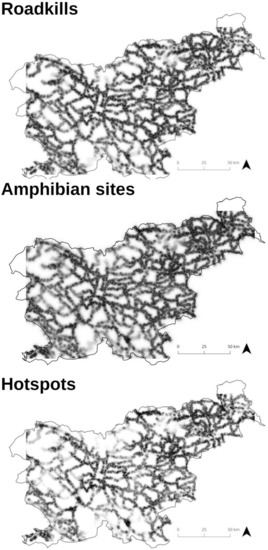 We analysed the influence of human or landscape factors on roadkill hotspots at the national level (Slovenia). Specifically, we aimed at: (1) identifying hotspots of roadkills; (2) analysing whether records of amphibian presences on roads are related to the distribution of water bodies; and (3) analysing which factors (proximity to water bodies or human factors) explain the distribution of hotspots.