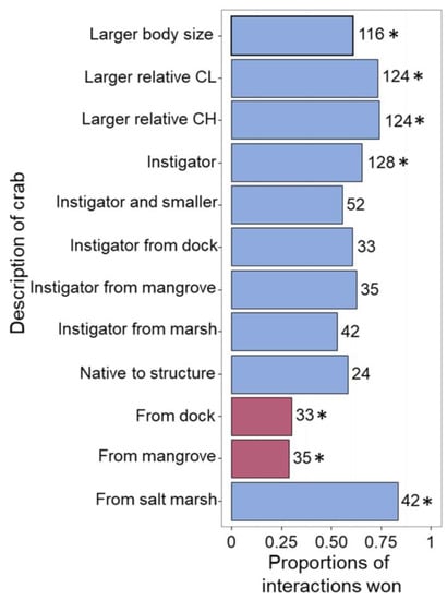 Proportion of interactions won by a variety of categories of competitor. Numbers represent the number of interactions examined while asterisks (*) represent significant effects (α = 0.05). Blue bars represent proportions above 0.5 while red bars represent those below 0.5.