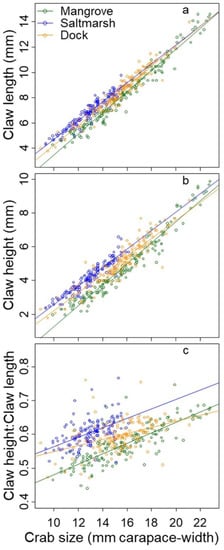Relationships between A. pisonii size and (a) claw length, (b) claw height, and (c) claw-height:claw-length ratio.