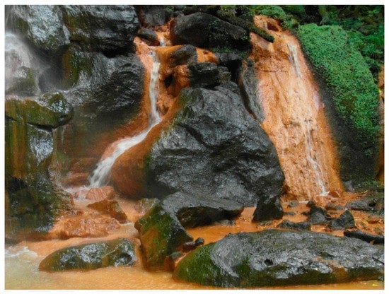 The Acquarossa river is located close to the city of Viterbo (Italy) and represents a site of naturalistic and archaeological interest where the Etruscan civilization developed around 625–550 B.C. The metallurgical activity on which the economy of this population was based led to the spread of heavy metals throughout the area [], mainly iron and arsenic []. Along the whole river course, rocks are covered by a red and a black biofilm (epilithon). As previously described [], these epilithons are characterized by high heavy metal concentrations, suggesting that they might represent natural “filters” for the river. Interestingly, the two kinds of epilithic biofilm are characterized by peculiar bacterial communities, from both genetic and phenotypic viewpoints. These bacterial communities were differently spatially distributed in the two biofilms, depending on the chemical composition of each kind of biofilm. Consequently, the spatial distribution led to the development of specific phenotypic characteristics in the two biofilms (i.e., heavy metal and antibiotic resistance patterns, antagonistic interactions). Along the river course, one encounters the Infernaccio waterfalls (42°31′38.55″ N, 12°07′52.1″ E), where the presence of the red epilithic biofilms persists on the rocks surrounding the bottom of the waterfall and, at the same time, the rocks behind the waterfalls are red too, since iron-enriched water falls continuously from some twenty meters height. Interestingly, contrarily to the rest of the river course, the black epilithic biofilm is almost absent on the rocks around the waterfall.