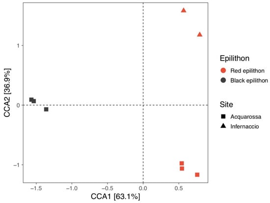 Sequences were clustered into operational taxonomic units (OTUs) using the UPARSE pipeline [], as described previously []. Briefly, raw reads were merged into a single amplicon sequence using the ‘fastq_mergepairs’ command. The identity threshold was set to 80% in order to account for long overlaps (2 × 300 bp, V3–V4). The ‘filter_lowc’ command before quality assessment was used to find and remove low complexity reads (namely those containing repeated sequences and/or regions that are highly enriched for just one nucleotide). Merged reads were then quality checked as described in []. An additional quality filtering step and sequences clustering were performed []. Representative sequences were taxonomically classified using the ‘sintax’ command along with the RDP training set (version 16). Sequences that were not assigned to Bacteria domain were removed to minimize possible contaminants due to PCR amplification []. The OTU table was produced with the ‘otutab’ command. Sequences are part of the previous submission reported in [] (BioProject accession PRJNA412007). Differences between epilithon types (black vs red) and sampling sites (Infernaccio vs Acquarossa) were tested using permutational multivariate analysis of variance using distance matrices as implemented in the ‘adonis2′ function of the R vegan package (version 2.5.5). The overall distribution of samples was plotted using canonical correspondence analysis (’cca’ function of vegan package). Operational taxonomic units that were resolved at genus level were used to provide a more in-depth insight into the two bacterial communities inhabiting black and red epilithons. LDA Effect Size (LEfSe) [] was used to find bacterial genera linked to a peculiar type of epilithon, as described in the LEfSe tutorial reported at: https://bitbucket.org/biobakery/biobakery/wiki/lefse.