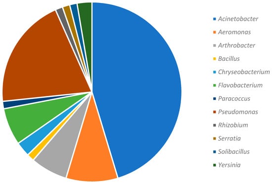 Each of the 75 sequences obtained was compared with those available in databases through the BLASTn option of the BLAST software. Data obtained revealed that the 75 bacterial isolates were affiliated to 12 genera with a dominance of Acinetobacter and Pseudomonas (Figure 4).