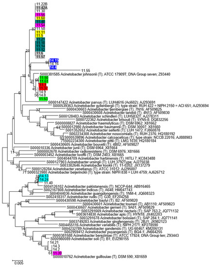 Phylogenetic analysis of Acinetobacter and Pseudomonas bacterial strains was performed as described in Materials and Methods and data obtained are shown in Figure 3, Figure 4, Figures S2 and S3. The Acinetobacter strains can be split into three main taxonomic groups: the first one including most of the strains, was taxonomically related to A. johnsonii; a second group related to A. pakistanensis (strains 14.13, 14.24, 11.40), and a third group related to A. guillouiae (strains 14.2, 14.3, 14.21 and 11.39); all the other isolates joined a single cluster (Figure 5).