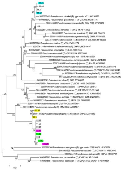 Also, in the Pseudomonas 16S rRNA gene phylogenetic tree three main groups can be recognized (Figure 6): the first one embedding isolates 11.26, 11.46, 11.32 and 11.2 and taxonomically related to the group of P. reinekei/P. granadensis; a second group of strains related to P. protegens (most of the isolated bacteria) and strain 14.6 taxonomically related to P. kireensis. Pseudomonas strains belonging to the same RAPD haplotype are taxonomically related to the same species.