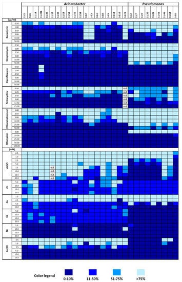 Resistance patterns towards antibiotics and heavy metals of the Acinetobacter and Pseudomonas strains isolated from the Infernaccio waterfalls. Colors: navy 0–10% growth; blue 11–50% growth; deep sky blue 51–75% growth; light blue > 75% growth. Abbreviations: n.d., not determined.