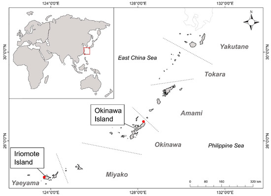 The coral reefs of southern Japan are at the top of the list in terms of global marine conservation priority, when considering the region’s high levels of multi-taxon endemism and the high risk of biodiversity loss due to overexploitation and coastal development [23]. The Ryukyus Islands (RYS), i.e., Ryukyu Archipelago, encompass the southernmost region of Japan and include islands of different geological formations, ages, and sizes [24,25]. The surrounding waters and coral reefs fringing the islands are strongly influenced by the warm water brought from tropical areas around the Philippine islands by the Kuroshio Current, which flows towards the north along the west side of the island chain [24,25,26], extending warm water conditions northerly. As such, the RYS experience higher sea temperatures compared to other areas at similar latitudes, such as eastern Australia [27,28], thus creating unique coral reef conditions. Serious taxonomic and geographic biases are present in marine biodiversity research in the RYS. Most work in the RYS has been conducted on the phyla Pisces, Crustacea, and Cnidaria, with the majority of research on hermatypic hard corals (Scleractinia) and, surprisingly, far less work on other commercially important groups such as Echinodermata and Mollusca, as well as on other understudied small and cryptic coral reef taxa [25].