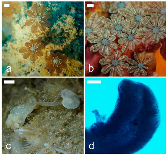 Morphological variation: There is a difference in color between the polyps of the holotype (NSMT-Co 1681) and paratype (NSMT-Co 1682); the polyps of the holotype are brown with a white oral disc and base of the tentacles and the polyps of the paratype are whitish yellow with a bright blue oral disc (Figure 2a,b).
