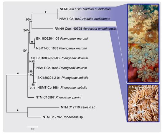 Phylogenetic reconstruction using a four-marker concatenated dataset (28S rDNA + COI + mtMutS + ND6) among Hadaka nudidomus gen. nov. et sp. nov., closest sister species Phenganax spp. and outgroup specimens Rhodelinda sp. and Telesto sp. (total n = 12). The best maximum likelihood tree is shown, with values at branches representing bootstrap probabilities in percentages (top/left) and Bayesian posterior probabilities (bottom/right). In situ photographs are shown for the two octocoral species that are sclerite-free and lack free pinnules, Hadaka nudidomus gen. nov. et sp. nov. and Acrossota amboinensis. Photograph credit: in situ image RMNH Coel. 40798 Acrossota amboinensis, by Daniel Knop (modified from [52]; reproduced with permission from copyright holder).