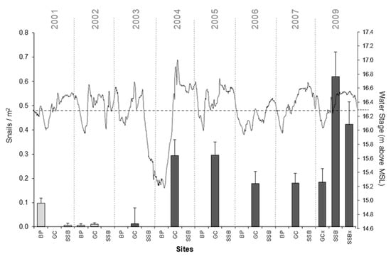 Figure 2. Pomacea paludosa (gray bars) and Pomacea maculata (black bars) snail densities (per m2) in LTOHO sites from 2001 to 2009. We did not sample in 2008. Water stage data shown as meters above mean sea level (MSL). Dashed horizontal line represents approximate ground level at the sites. BP = Brown’s Point. GC = Goblets Cove. SSB=South Steer Beach. GCx and SSBx = sampling sites in the vicinity of GC or SSB.