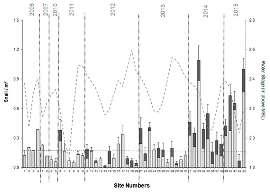 Figure 3. Pomacea paludosa (gray bars) and Pomacea maculata (black bars) snail densities (per m2) in southern WCA3A, and its associated lower ground elevations, from 2006 to 2015 (Figures S1–S8). For each year, the number of reported density estimates equals the number of sites sampled except for two sites in 2011 and one site in 2015 in which we found zero snails in throw traps. We did not sample in 2008–2009. Here, we report snail density estimates only from sites where we found snails in traps (42 different sites, some sampled more than once, for a total of 50 density estimates). Sites 1, 2, and 33 were sampled in more than one year. Water stage data shown as meters above mean sea level (MSL). Dashed horizontal line represents approximate ground level at these southern WCA3A sites.
