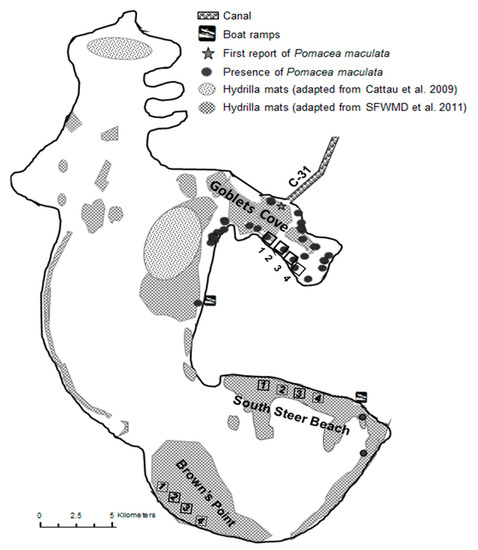 Figure 4. Locations of non-native apple snails in sites we sampled from 2003–2009 on LTOHO. First record, which was outside of sampling sites (2001), shown near the outflow of the C-31 canal. Pomacea maculata eggs and snails were subsequently observed outside of Goblets Cove, including throughout hydrilla that covered large portions of the lake. Hydrilla coverage adapted from Cattau et al. [51] was based on descriptions for 2009. Hydrilla coverage adapted from SFWMD et al. [52] was for 2008 for coverage levels of >50%. Our observations on hydrilla coverage were consistent with these cited reports.