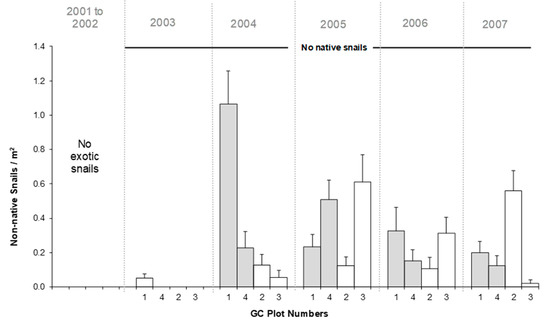 Our data from LTOHO suggest that the combined effects of the 2004 drawdown, vegetation management, and hurricanes leading up to our 2004 sampling may have facilitated P. maculata dispersal into our GC littoral zone study plots. High-stem-density, monoculture pickerelweed dominated all sites and plots in 2003 with 100% coverage. Following 2004 treatments and hurricanes, pickerelweed coverage dropped to 45% of our traps in GC (Table 1), and P. maculata density increased from near zero up to 1.0 snails/m2 (see Figure 5; recall that snails were found bordering our study plots on the littoral zone edge in 2001–2003). We found statistically significant effects of the year (X2 = 8.26, 3 df, p = 0.041), treatment (X2 = 4.08, 1 df, p = 0.0433), and their interaction (X2 = 20.25, 3 df, p = 0.0002) on P. maculata densities from GC (We found no snails in SSB or BP from 2004–2007; we excluded these sites from analyses, precluding the inclusion of a site effect in our models.). Treatment effects were most evident in GC plots 1 and 4 (scraped) compared to GC plots 2 and 3 (control) in 2004 (Figure 5; X2 =21.6, 1 df, p = 0.0001); however, over time this initial effect appeared to wane. The 2005 through 2007 samples in GC exhibited no discernible pattern in scraped vs. control plots (Figure 5).