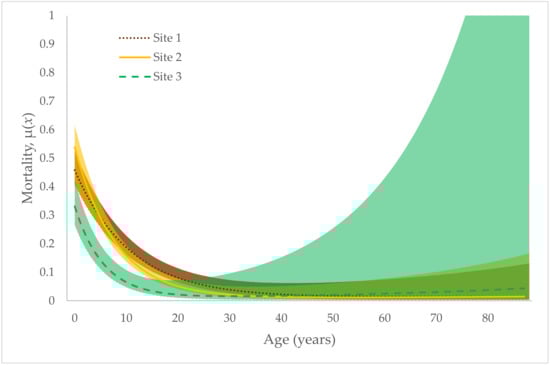 The mortality function in BaSTA describes how the risk of mortality changes with age and is defined as µ(x|θ), where x is age and θ a vector of parameters []. We compared a basic model with only site as a covariate to models including growth, reproductive output and shrinkage. All four different underlying mortality models in BaSTA were tested to find the model best suitable for each site, life period and covariate: the exponential mortality model (EX) where mortality is constant,