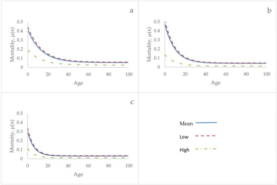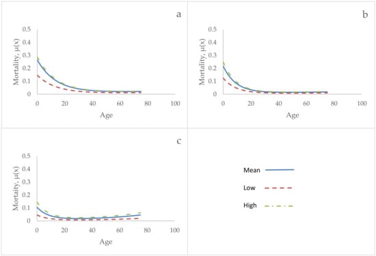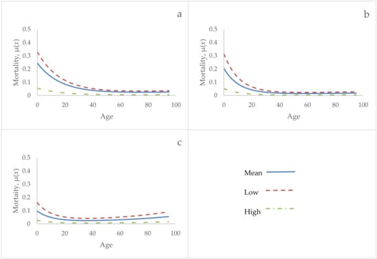 Age trajectories of mortality as function of different levels of shrinkage (mean, low (2.5th percentile) and high (97.5th percentile)) at site 1–3 (a–c) using the Gompertz bathtub model. Mortality is presented from germination to the age where the population from the site with the lowest mortality (site 2) reaches 1% of its original size (Figure A1). Mean = 0.16, 0.24 and 0.28, Low = 0, High = 1 at sites 1–3, respectively.