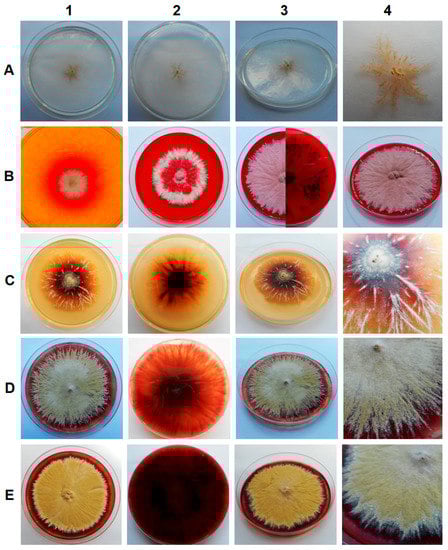 Macroscopic observations of 7- (B1), 14- (B2) and 28-day-old (A, B3, B4, C, D, E) fungal culture isolated from soil and sediment in the Harmanecká Cave, Slovakia, on various media: A. Czapek-Dox agar, B. DTM, C. MEA, D. PDA, and E. SGA.