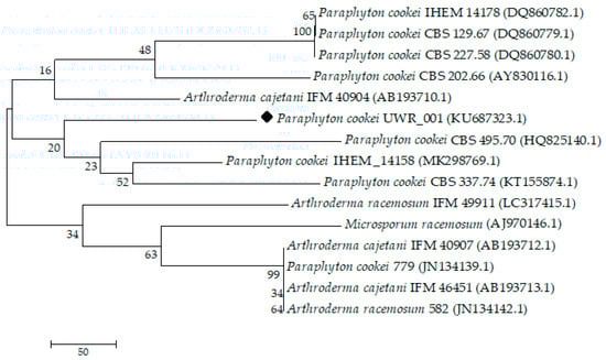 The comparison of those microscopic structures with the simultaneous macroscopic observation of the culture allowed for their probable affiliation to the Microsporum cookei clade and identification, with high probability, as Paraphyton cookei (Ajello) Y. Gräser, Dukik & de Hoog. Then, one isolate (UWR_001), out of ten collected during research was selected for further studies as a representative of a group with the same phenotypic features. The genetic studies were carried out in order to confirm preliminary classification. The ITS rDNA sequences (722 bp) were obtained from the isolate and they were compared to the sequences deposited in the GenBank of the National Center for Biotechnology Information by using the BLAST algorithm. This analysis confirmed that described dermatophyte had close affinities to P. cookei, and its ITS rDNA sequences were deposited in GenBank under the accession number KU687323.1. The propagation structures of the isolate were stored in the fungal collection of the Department of Mycology and Genetics, Institute of Genetics and Microbiology, University of Wroclaw, Poland. In addition, our research showed that the UWR_001 isolate belongs to one main group along with P. cookei CBS 495.70 (HQ825140.1), P. cookei IHEM_14158 (MK298769.1), and P. cookei CBS 337.74 (KT155874.1). It was phylogenetically related to the greatest extent to P. cookei CBS 495.70 (HQ825140.1), an isolate from the soil sample in the Netherlands (Figure 3).