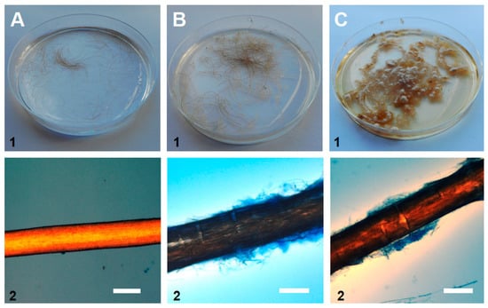Macroscopic observations of 28-day-old fungal culture on (1) a Petri dish in a hair perforation test in vitro and (2) microscopic observations of the hair (dyed with lactophenol cotton blue). A. negative control without fungi (no mycelium or hair pitting), B. tested sample of P. cookei KU687323.1 - UWR_001 (fungal growth and hair pitting), and C. positive control with T. mentagrophytes (observations identical to the tested sample). Scale bars: 100 μm.
