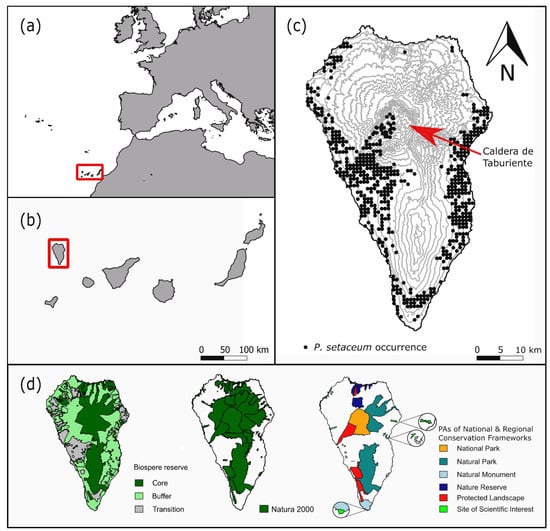Figure 1. Location of the Canary Islands (a) and the position of La Palma within the archipelago (b). Distribution of Pennisetum setaceum occurrence points after correction for autocorrelation (nthinned = 561) that was used for species distribution modeling (c). Biosphere reserve (left, d), Natura2000 sites (middle, d), and nationally and regionally designated protected areas (right, d).