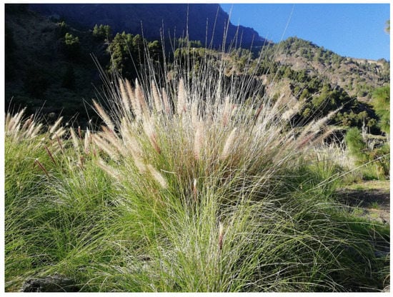 65. García-Gallo, A.; Wildpret de la Torre, W.; Rodríguez Delgado, O.; Pérez de Paz, P.L.; León Arencibia, M.C.; Suárez Rodriguez, C.; Reyes-Betancort, J.A. El xenófito Pennisetum setaceum en las islas Canarias (Magnoliophyta, Poaceae). Vieraea 1999, 27, 133–158. [Google Scholar]