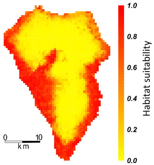 Figure 3. Projected suitable habitat conditions of P. setaceum on La Palma based on the ensemble model of generalized linear model (GLM), gradient boosting machine (GBM), random forest (RF), and maximum entropy model (MaxEnt). Habitat suitability ranges from 1 (high probability of occurrence, red) to 0 (low probability of occurrence, yellow).