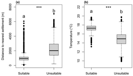 Figure 4. (a) Pixels that were modeled as suitable habitat for P. setaceum show smaller distances to the nearest settlement compared to pixels without P. setaceum. (b) Average mean annual temperatures of pixels with P. setaceum presence are considerably higher compared to pixels where the species is absent. Highly significant results are indicated by three asterisks.