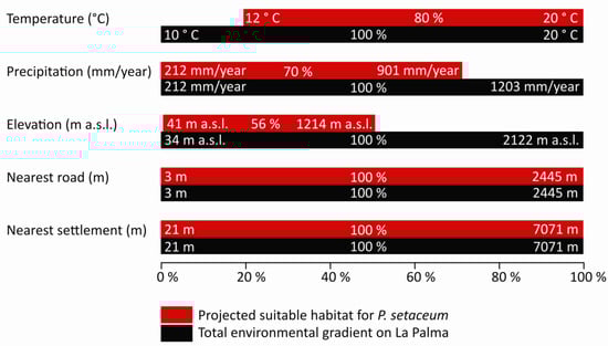 Figure 5. Total environmental gradients of mean annual temperature, annual precipitation, elevation, nearest road, and nearest settlement on La Palma (black bar). Red bars show the range of the environmental gradients projected to represent a suitable habitat for P. setaceum on La Palma. Note that the gradients elevation, nearest settlement, and nearest road do not start at zero due to calculations made on the bases of mean values for pixels the size of 500 × 500 m.