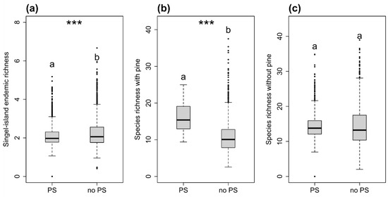 Figure 6. (a) Single island endemic plant species richness in projected suitable and unsuitable habitat for P. setaceum. (b) Total species richness in areas suitable and unsuitable for P. setaceum. (c) Species richness of unsuitable compared to suitable habitat excluding the Pinus canariensis forest. Highly significant results are indicated by three asterisks.