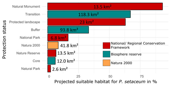 To evaluate modeling results in combination with designated areas of different protection status we considered the locations of the core, buffer, and transition zone of the biosphere reserve [59], Natura 2000 sites defined by the EU Habitat Directive [60], and nationally/ regionally designated protected areas, which include the national park, protected landscapes, natural parks, natural monuments, sites of scientific interest, and nature reserves [61]. The vector data was rasterized and scaled to 500 × 500 m. We calculated the projected suitable habitat for P. setaceum within designated areas of each protection status (cover in % and km²).