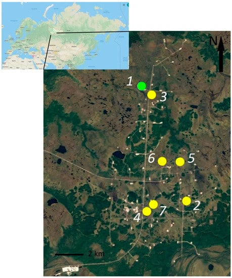 Study sites in the sphagnum bogs of the Ershov oil field in the Vakh River basin: number of studied sites, 1–7; green point, unpolluted site 1; yellow points, polluted sites 2–7.