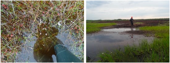 Study sites in the sphagnum bogs of the Ershov oil field in the Vakh River basin: site 1, referenced (a); site 7, polluted by mineral oil (b).