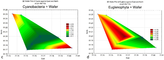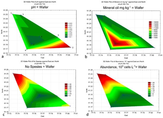 The difference between distributions of the bioindicator’s data and the chemical data in the studied sites can be better recognized with help of the ecological maps that were constructed in the Statistica 12.0 program on the base of Table 1 and Table 3. Figure 3, Figure 4, Figure 5, Figure 6 and Figure 7 show the distribution of chemical variables and of the algae species-indicators across the studied sites. It can be seen that water pH was higher in the eastern part of the bogs of the Ershov oil field (Figure 3a), the oil concentration has high values in the station 7 with decreasing of the value in the periphery (Figure 3b). Species richness of algae community and abundance were maximal on control site 1 on the northeastern part of bog (Figure 3c,d).
