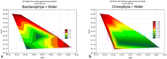 The bioindicator analysis in combination with statistically generated maps that was previously used for the waterbody surface area and for the catchment basin analysis [] here was used for the first time for the bog surface. A comparison in the distribution of ecological groups and environmental variables with maps helped us to reveal the relationships between oil concentration in the bog surface mass and the distribution of salinity and organic pollution algae indicators. Currently, we do not have comparable data of bioindicator distribution from the nearby bogs because this approach was used for the first time, but the correlation of salinity and nutrients impact is known for the bogs and swamps from different regions [].