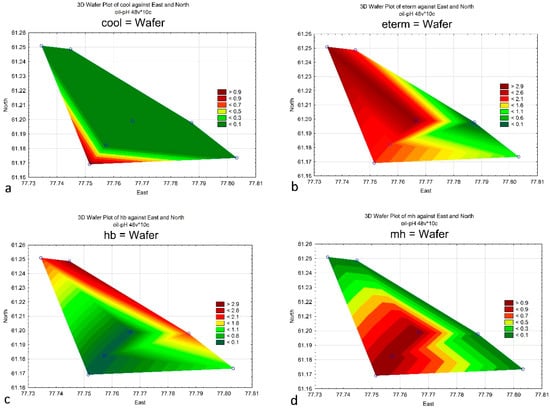 Indicators of water temperature marked the area in the southwestern part of the bogs of the Ershov oil field as the coolest one (Figure 5a), and all western areas as temperate in temperature (Figure 5b). Water salinity is a very important variable for the bogs and the maps show that halophobic species preferred control site (Figure 5c), whereas mesohalobes in contrary were richest near the contaminated area (Figure 5d).