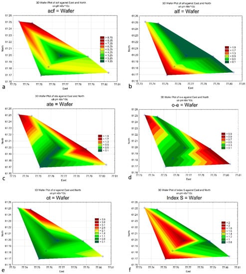 Distribution maps for Index saprobity S and species indicators: acidophiles (a), alkaliphiles (b), ologo-eutraphentes (c) species with autotropic nutrition (d), oligotrophic water indicators (e), and Index saprobity S (f) in seven studied sites of the bogs of the Ershov oil field in the Vakh River basin of the KMAO-Yugra.