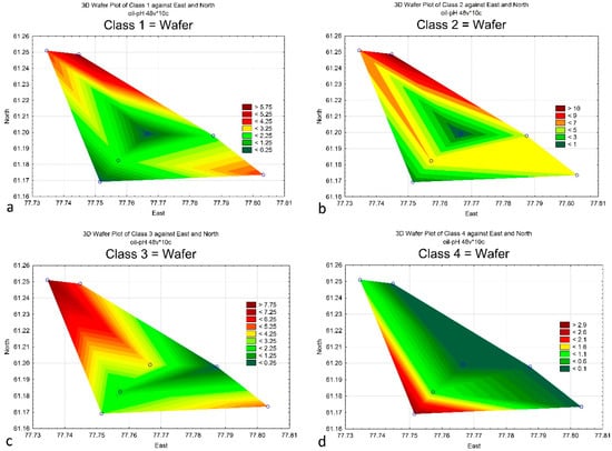 Distribution maps for indicators of Water Quality Class 1–4 (a–d) in seven studied sites of the bogs of the Ershov oil field in the Vakh River basin of the KMAO-Yugra.