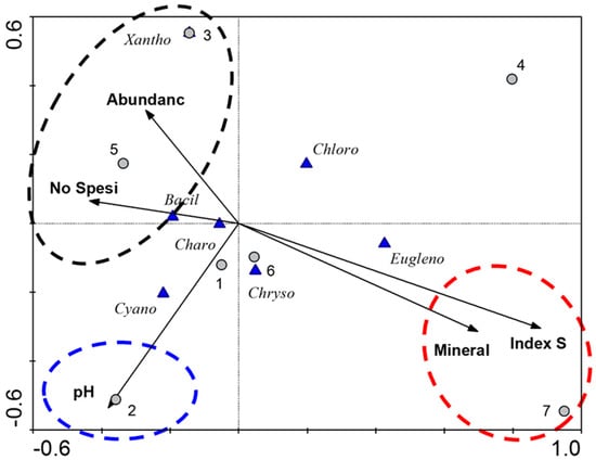 Relationships between the biological (number of species in the taxonomic Divisions from Table 3) and chemical variables (from Table 1) of studied sites in the Ershov oil field were calculated in the CANOCO program. Figure 9 shows that the environmental variables divided into two different groups. As shown, mineral oil and organic pollution (as Index saprobity S) affected the algal community mostly in site 7, with the prevalence of the euglenoid species as a result (red dashed line). Water pH was only one variable that affected site 2 communities with cyanobacteria flourishing (blue dashed line). Such biological variables as species richness and the abundance of the algal cells that can be taken into account as variables, a high level of which characterizes environments most comfortable for algae development, and which were represented by the third group in Figure 9 (black dashed line). Sites 2 and 5 communities were most abundant and species-rich with a prevalence of diatom and Xanthophyceae algae. Therefore, these sites can be assessed as the most rehabilitated and close to the control site 1.