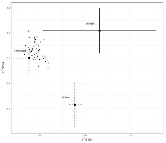 Mean (±SD) δ13C and δ15N in moose forage groups (sources) collected on Isle Royale, Michigan, USA. Small black dots are individual moose values (mixtures). Trophic discrimination factors have been added to the sources (Δ13C = 3.0‰, Δ15N = 2.7‰).