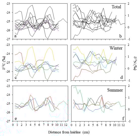 Variation in δ13C (a,c,e) and δ15N (b,d,f) along hooves from adult female moose that died during the winter (c,d, n = 7) and the summer (e,f, n = 4) from starvation or predation at Isle Royale National Park, USA. Hooves were sampled in 0.5-cm increments from the hairline to the tip. Different colors correspond to individual moose.