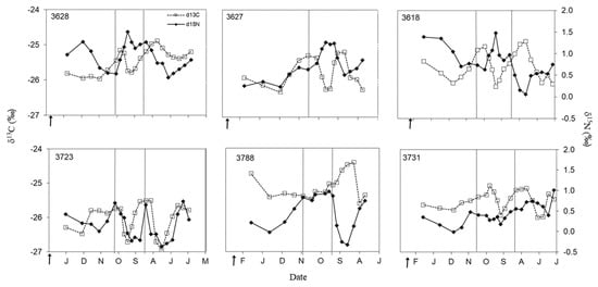 δ13C and δ15N isotope chronologies along hooves (from hairline to tip) of six adult female moose from the eastern end of Isle Royale National Park, USA. Chronologies are based upon growth rate of captive caribou (Barnett 1994) scaled to moose hoof length. Vertical dotted lines correspond to position of growth arrest lines (GALs) along hooves. Arrows indicate date of death for each individual.