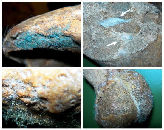 Macroscopically visible active growth of micromycetes on the surface of the bones of Ursus spelaeus exhibited in the Niedźwiedzia Cave, Kletno, Poland. All the photos taken after two weeks incubation of bones at 20 ± 1 °C under laboratory conditions (specified in Section 2).