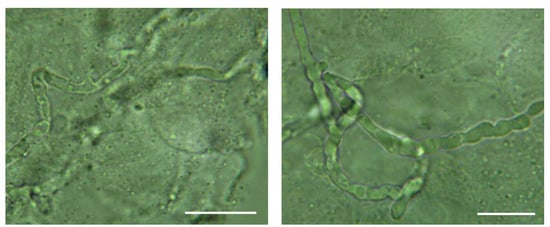 The bones were visually inspected immediately after delivery to the laboratory. Collected bones both with and without visible traces of biodeterioration were placed in new sterile, non-pyrogenic, polystyrene boxes covered by parafilm. At the bottom of the box were sterile gauze pads moistened by sterile nanopure water, to obtain the conditions very similar to the slide culture technique incubation []. The boxes with bones were incubated in the dark two weeks at temperature set up at 20 ± 1 °C. Direct microscopic examination of bone scrapings was performed to show the presence of mycelial elements inside of dead bone tissue. Bone scrapings were rubbed using both sterile surgical scalpel and drill to obtain samples from deeper layers of bone. It should be mentioned that after taking swabs to set up cultures, each time before bone scrapings were rubbed using both sterile surgical scalpel and drill the bone surface was wiped with 70% ethanol to avoid any contaminations from surface. Microscopic preparations for direct examinations were prepared in dimethyl sulphoxide (DMSO) with 10% KOH, both from POCH (Gliwice, Poland) as clearing fluid [].