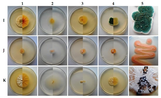 Macroscopic observations of 7- (A–I), 14- (K1–K4), 21- (C) and 28-day-old (K5) fungal culture, top and bottom view of a colony on various media at 25 ± 1 °C (1. Czapek yeast autolysate (CYA), 2. Czapek-Dox agar, 3. malt extract agar (MEA), 4. and 5. potato dextrose agar (PDA)) isolated from Ursus spelaeus bones in the Niedźwiedzia Cave, Poland: (A) Absidia glauca, (B) Aspergillus fumigatus, (C) Chrysosporium merdarium, (D) Fusarium cerealis, (E) Mortierella alpina, (F) Mucor aligarensis, (G) Mucor plumbeus, (H) Penicillium chrysogenum, (I) P. expansum, (J) Sarocladium strictum, (K) Scopulariopsis candida. Photos collected in column 5 show close up of surface growth of each of the eleven tested fungal strains.