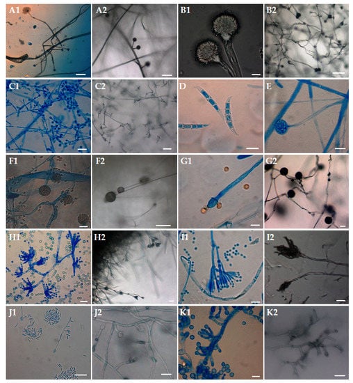 Microscopic observations of 21-day-old fungal culture on PDA at 25 ± 1 °C isolated from Ursus spelaeus bones in the Niedźwiedzia Cave, Poland: (A) Absidia glauca, (B) Aspergillus fumigatus, (C) Chrysosporium merdarium, (D) Fusarium cerealis, (E) Mortierella alpina, (F) Mucor aligarensis, (G) Mucor plumbeus, (H) Penicillium chrysogenum, (I) P. expansum, (J) Sarocladium strictum, (K). Scopulariopsis candida. Scale bars: A1, A2, B2, F1 = 100 μm; C2, G2, H2 = 50 μm; F2, I2, K2 = 20 μm; B1, C1, D, E, G1, H1, I1, J1, J2, K1 = 10 μm.