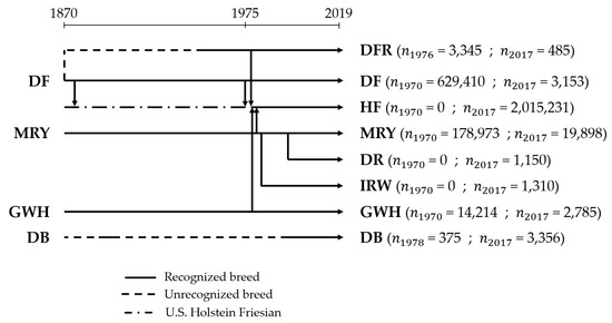 Development of Dutch cattle breeds from 1870 to 2019 and the number of cows per breed in 1970 (or in 1976 for DFR and 1978 for DB) and in 2017 (number of cows were based on [10,12,13]). DB: Dutch Belted; DF: Dutch Friesian; DFR: Dutch Friesian Red and White; DR: Deep Red; GWH: Groningen White Headed; IRW: Improved Red and White; MRY: Meuse-Rhine-Yssel.