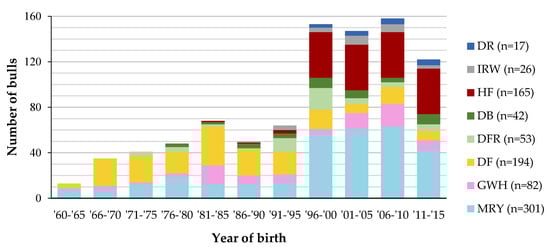 In 1975, three native dual-purpose breeds dominated the Dutch cattle population (Figure 1): Dutch Friesian cattle (76%), Meuse-Rhine-Yssel cattle (22%), and Groningen White Headed cattle (2%) [10]. Currently, more than 90% of the Dutch population consists of Holstein Friesian cattle [11]. After 1975, two additional native Dutch cattle breeds have been developed from the existing native MRY breed (Figure 1). These breeds were developed to conserve a breeding line with a characteristic color (Deep Red) and to develop a beef type breed (Improved Red and White). The herd books were established in 1988 and 2001, respectively.